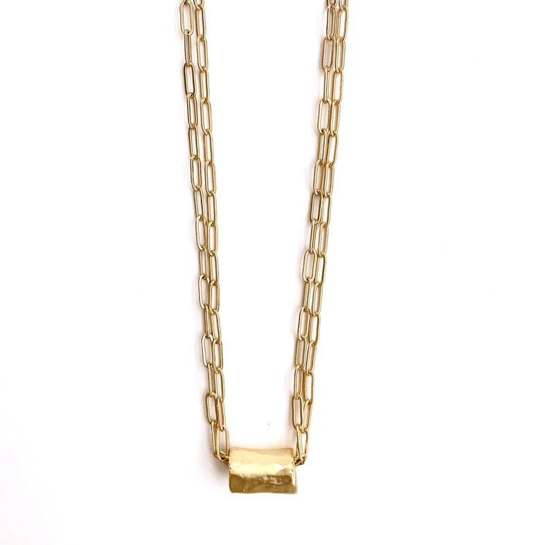 Our signature barrel collection! Our brushed gold barrel pendant on a brushed gold double chain has a richness that compliments any style and adds a sophisticated golden glow. Looks SO good