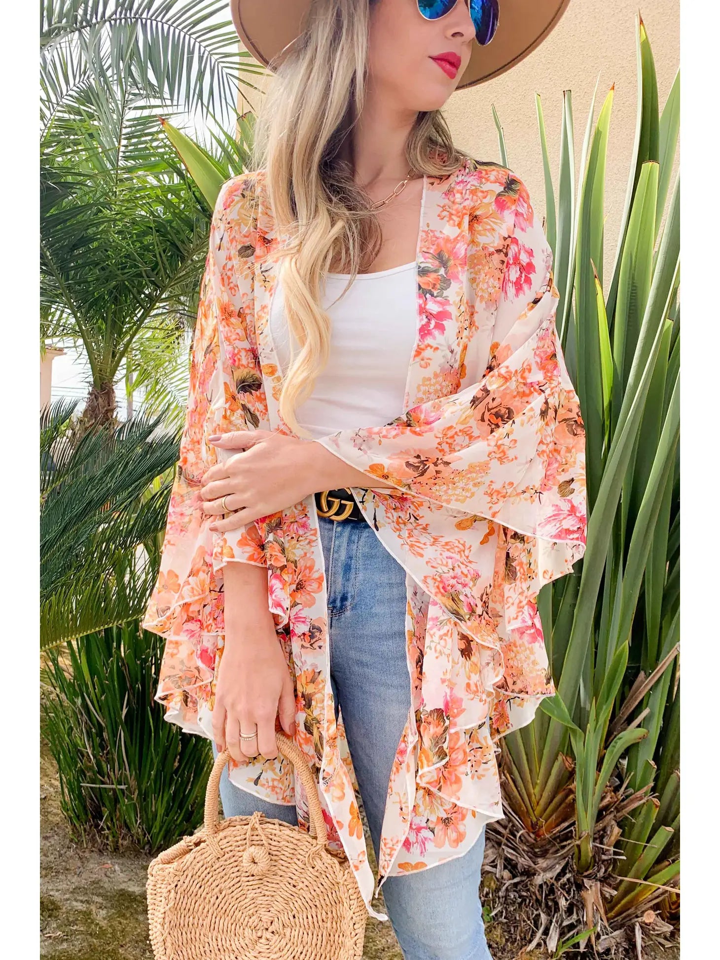 Floral Print Ruffled Sleeve Chiffon Kimono Cardigan