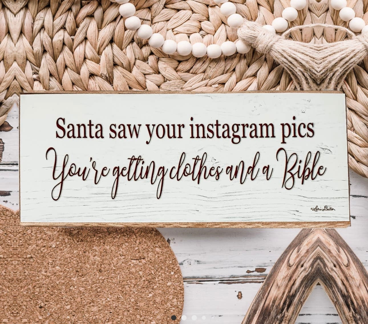 "Santa saw your Instagram pics - you're getting clothes and a Bible" wooden sign. I think we all know someone who needs this sign! Lol